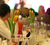 Neben den Lachern kam auch der kulinarische Genuss nicht zu kurz. Das Drei-Gänge-Menü wurde von Raoul Paschold, Inhaber & Küchenchef, mit seinem Küchenteam gestaltet und zubereitet. Die leckere Vorspeise bestand aus Meerrettich-Suppe im Glas mit Lachstatar, rotem Linsensalat, Ziegenkäse, Rote Bete Würfel und Feldsalat. Der Hauptgang: Schweinefilet im Blätterteig, Kartoffelbaumkuchen, Erbsen- & Karottenpüree. Feine Mousse-Variationen schlossen das fürstliche Diner süß ab.